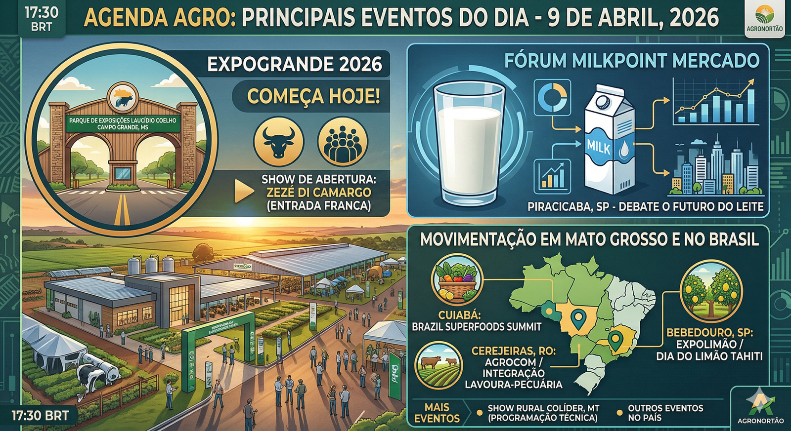 O calendário do agronegócio brasileiro está aquecido neste dia 9 de abril de 2026. De Mato Grosso do Sul a São Paulo, importantes eventos reúnem produtores, especialistas e empresas para discutir desde a sucessão familiar até as novas tecnologias para a produção de leite e grãos.