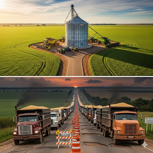 1. Dependência Excessiva do Modal Rodoviário: Cerca de 60% a 75% da safra brasileira é transportada por caminhões. Em Mato Grosso, essa dependência é ainda maior, chegando a quase 90% para o escoamento inicial da produção. Isso gera: