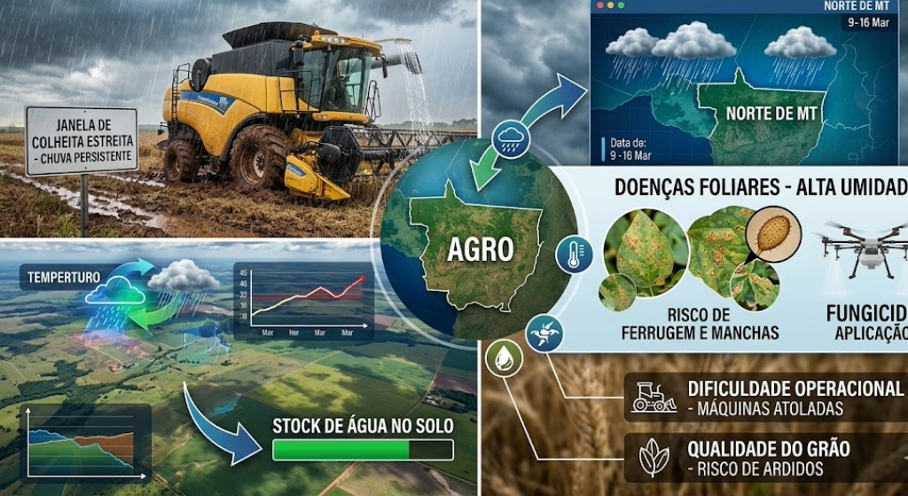 Para os próximos dias (período de 9 a 16 de março de 2026), o cenário climático no Norte de Mato Grosso continua sendo definido pela farta disponibilidade de umidade, com previsão de acumulados de chuva significativos. Embora essa condição seja excelente para a manutenção do armazenamento de água no solo e o desenvolvimento inicial das culturas de segunda safra, ela impõe desafios operacionais imediatos para as fazendas que ainda estão em fase de colheita ou plantio.