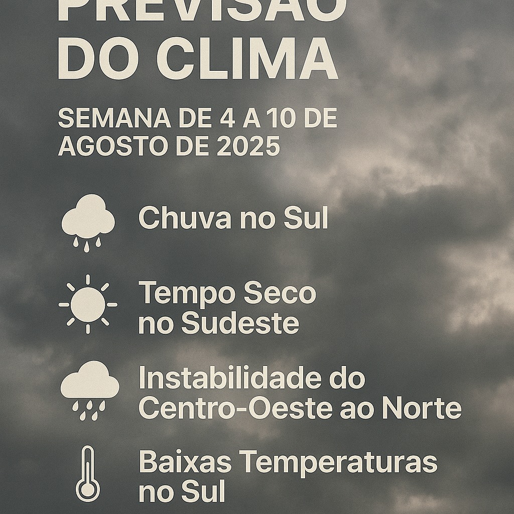 O clima é um fator determinante para as cotações e a produtividade agrícola. Com base em previsões recentes de portais como Agrolink e Notícias Agrícolas, a semana de 4 a 10 de agosto de 2025 apresenta condições variadas no Brasil, influenciando as culturas de inverno (como trigo) e a preparação para a safra 2025/26.