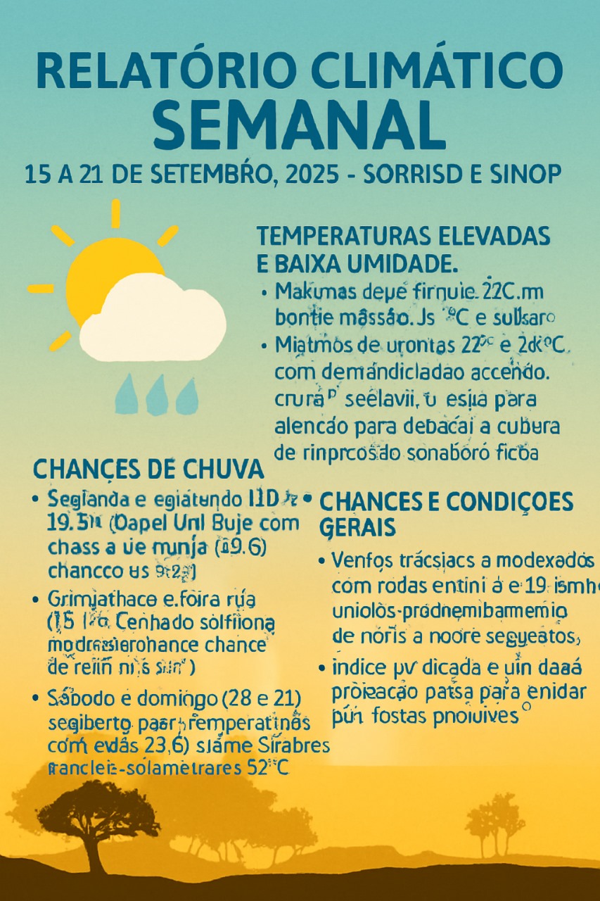 • Sábado e domingo (20 e 21/09): Céu parcialmente nublado com chance de pancadas isoladas (até 21%), temperaturas caem levemente para 32°C.