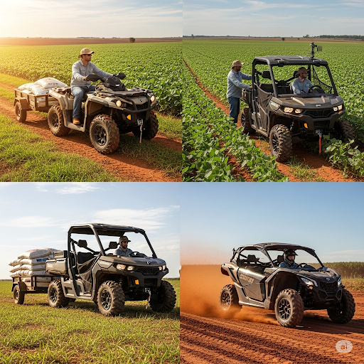 • Can-Am Outlander: Um ATV compacto com tração 4×4 ou 6×6, capaz de rebocar até 830 kg e carregar até 360 kg em racks. Ideal para monitoramento de lavouras e manejo de rebanhos.