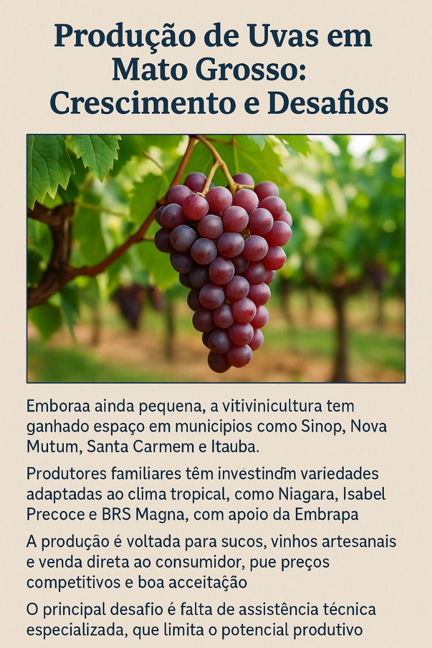 A produção de uvas em Mato Grosso, embora ainda incipiente, vem ganhando protagonismo em municípios como Sinop, Nova Mutum, Santa Carmem e Itaúba. O setor, impulsionado por produtores familiares, aposta em variedades resistentes ao clima tropical, como Niágara, Isabel Precoce e BRS Magna, com suporte técnico da Embrapa.